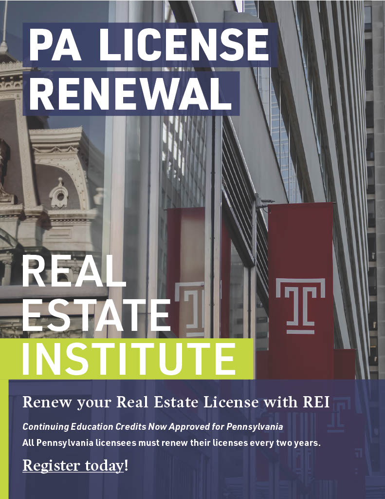 Start your real estate career, become a broker, and maintain your real estate license with our continuing education courses. The Real Estate Institute is the largest program for professional Real Estate education in Greater Philadelphia. Our courses prepare real estate salespeople, brokers, appraisers and property managers, as well as people simply interested in expanding their real estate knowledge.